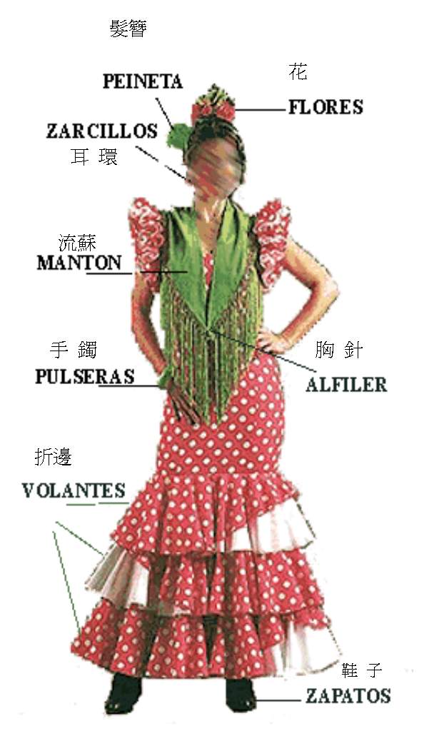 簡短地給flamenca的服裝下定義,在西班牙的地方獨特性的服飾風尚的功能具有發展性以及多樣化。把服裝的製作稱為吉他的形體,可以毫無疑問地突顯一位女性的美麗:開領口有尖的、圓的、及方的;根據時代的發展,頭髮用髮髻盤起來,是為了讓衣領看起來更勻稱,腰帶的使用讓裙撐及衣裙裙邊更加地呈現出來,使舞者移動時更加嬌柔、愉悅。Flamenca服裝常伴隨著不同及不可缺少的附屬裝飾品,如:頭上裝飾的花、手鐲、耳墜、裝飾用的梳子,這些物品在不同顏色及多變的組合配對,使得衣服在多變的樣式中提高了搭配可能性。